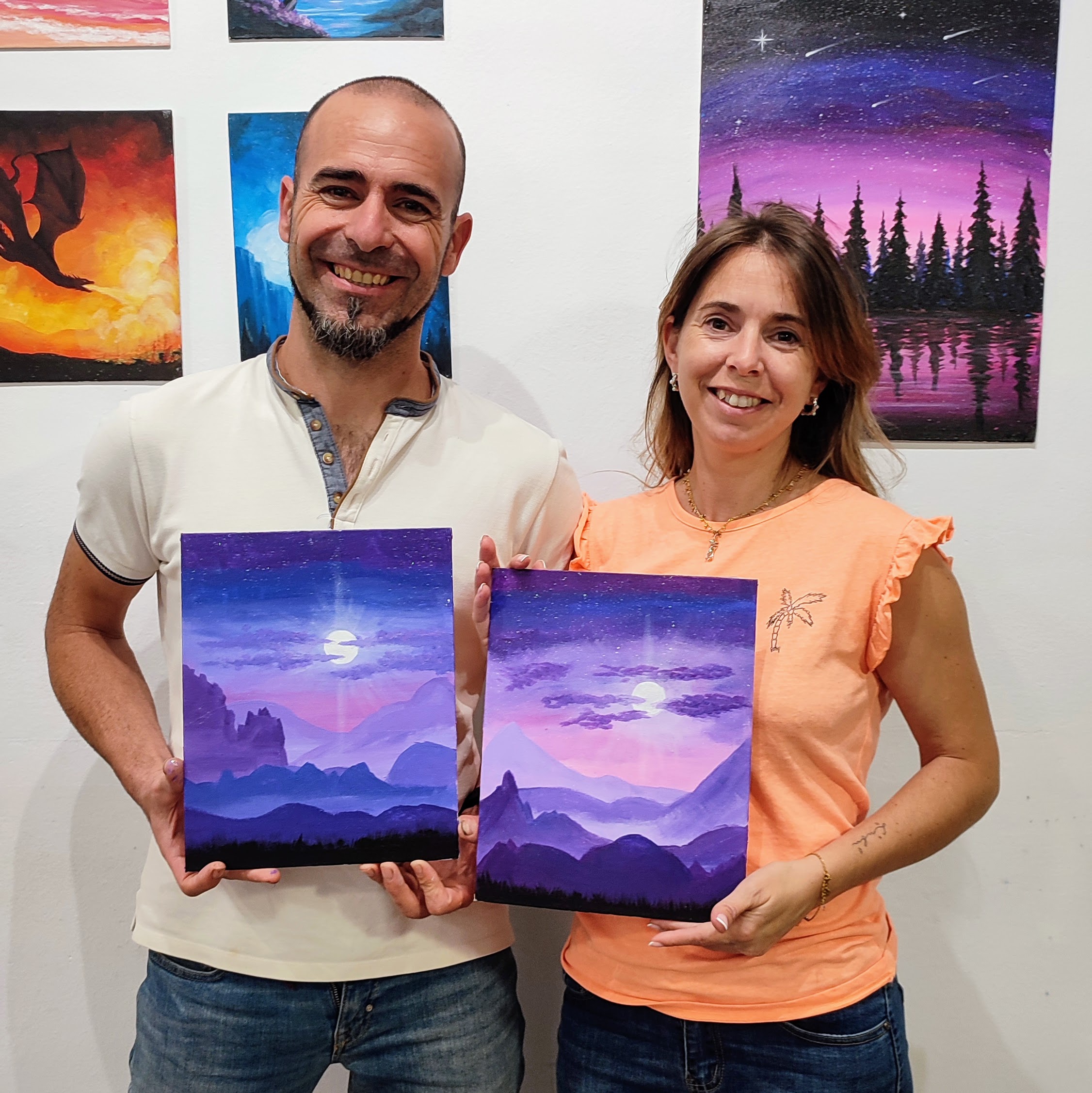 Hay cuadros que pueden adaptarse a este formato y otros no, este es uno de ellos. Si sois una pareja (o familia o amigos que viven en una misma casa), y queréis venir a «pincelear» juntos pero no queréis llevaros dos cuadros muy parecidos entre sí, ¡aquí tenéis la solución! Pintaréis vuestro propio cuadro, pero el dibujo quedará «unido» al de vuestro acompañante, así, además de ser súper divertido y colaborativo, al colgarlos juntos se verán como un sólo cuadro dividido en dos.